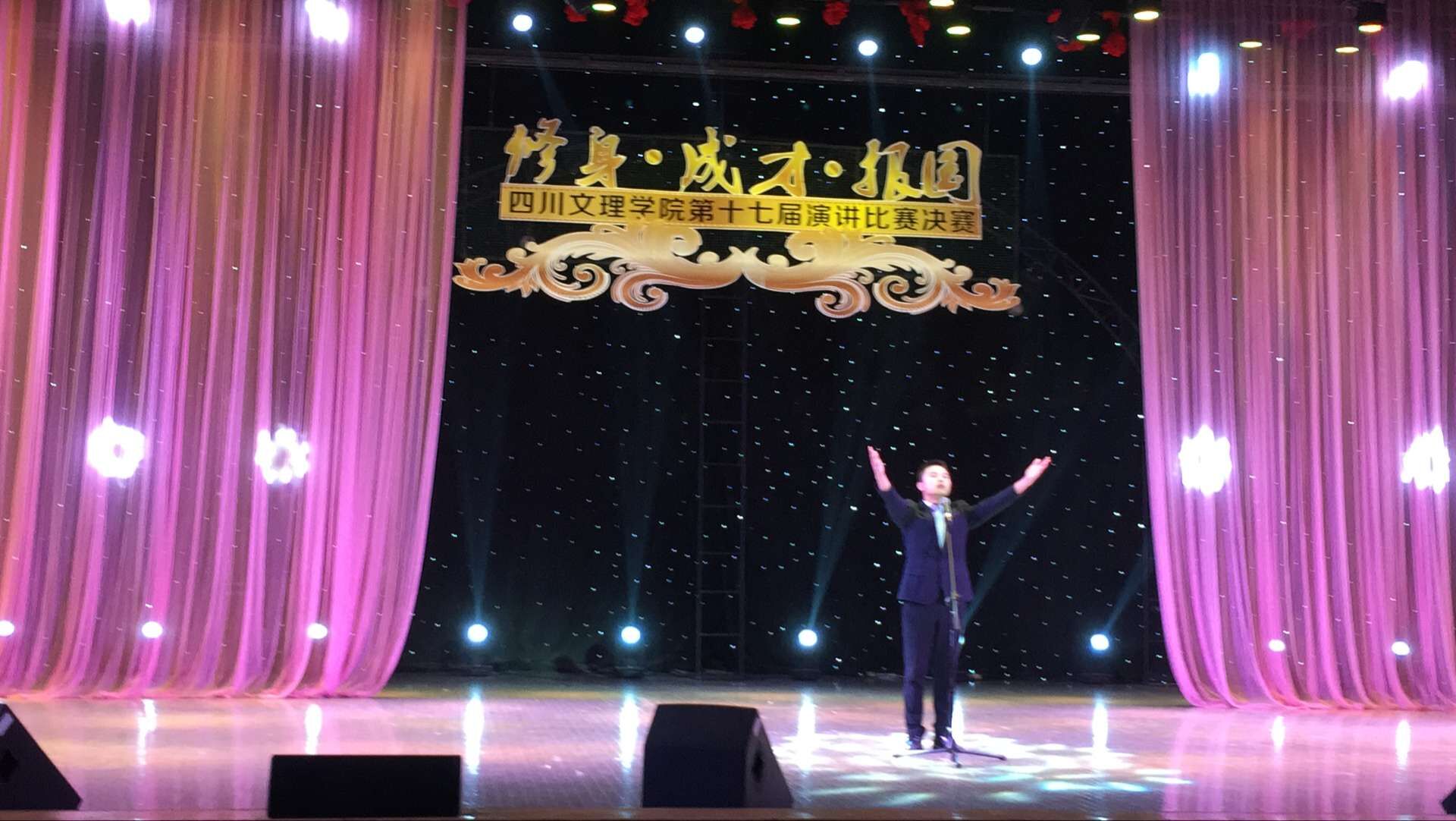 11月20日晚19点,由校团委主办的四川文理学院第十五届“修身•成才•报国”演讲比赛决赛在莲湖校区音乐厅举行。音乐与演艺学院选手朱九六以《追逐梦想,不再彷徨》成功问鼎。