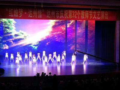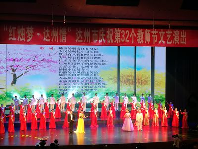 9月7日下午,由中共达州市委、达州市人民政府主办,达州市教育局承办的“红烛梦•达州情”——达州市庆祝第32个教师节文艺演出在巴山大剧院举行。我院选送的合唱《校园的春天》、舞蹈《青春梦•园丁梦》两个节目参加了此次演出,获得广泛好评。