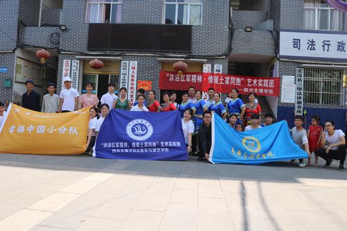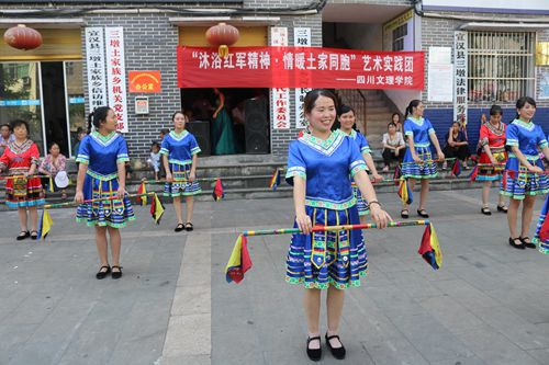 为纪念改革开放四十周年,将改革开放的文艺成果与少数民族同胞共享,引导学生将所学化为所用,切实服务于地方人民。我院结合专业特色、学生特点,组建了“文艺实践团”,深入革命老区宣汉漆树土家族乡和三墩土家族乡进行文艺汇演。
