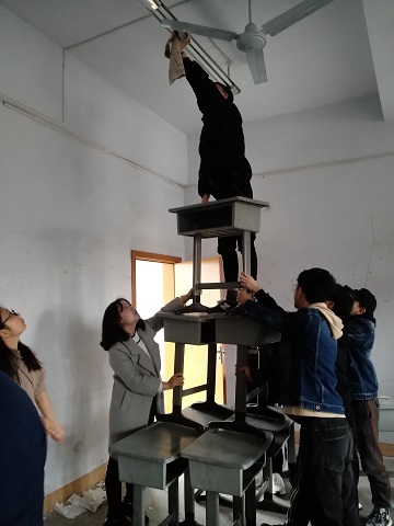 每个班级按事先划分的区域,各就各位,班级内部也进行了明确的分工,同学们不畏脏不怕累,主动地参与到打扫行动中来。大家配合默契,认真打扫每个角落,特别是平时清洁工没有打扫到的死角。老师们也亲力亲为,并挨着检查指导各班的打扫,不时提醒同学们要注意安全。经过近两个小时的努力,音演楼焕然一新,大家心中都是满满的成就感。