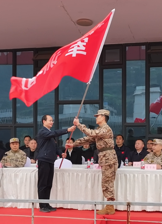 开训仪式开始,全体肃立敬礼,奏唱国歌,升国旗。学校党委书记黄涛向军训团授予团旗,开训仪式正式拉开序幕。