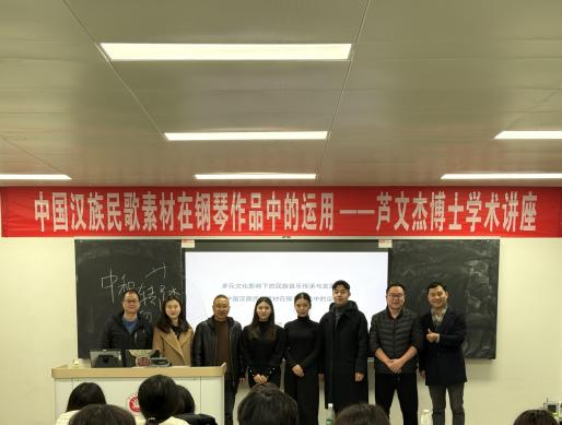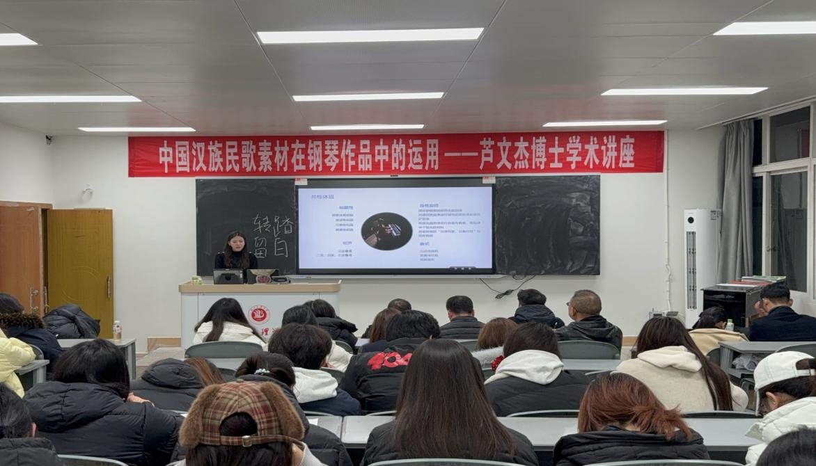 12 月 19 日 ,音乐与演艺学院芦文杰博士成功举办了学术讲座《多元文化影响下的民族音乐传承与发展——中国汉族民歌素材在钢琴作品中的运用》。音乐与演艺学院副院长冉明、音乐教研室部分教师及学院音乐专业各年级学生出席本次活动。