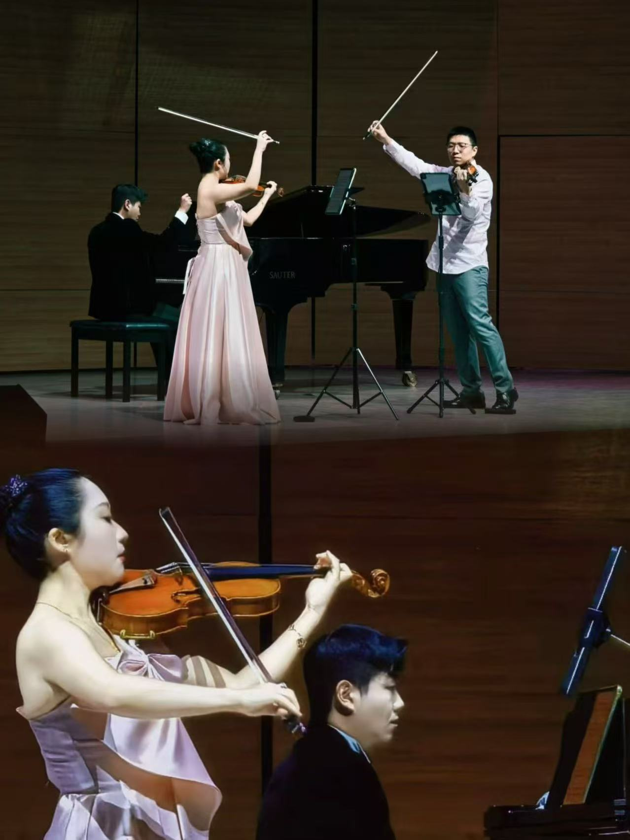 室内乐部分,周阳博士与王潇博士先选奏了19世纪马扎斯《十二首小二重奏》作品38,来讲述室内乐并非高门槛,初入门的小提琴学习者们同样能在合奏中体会室内乐聆听与配合的乐趣。压轴曲目为肖斯塔科维奇《钢琴与双小提琴的五首小品》,由三位演奏家共同呈现,在舞曲的抒情与灵动对比中结束了本场精彩的音乐会。