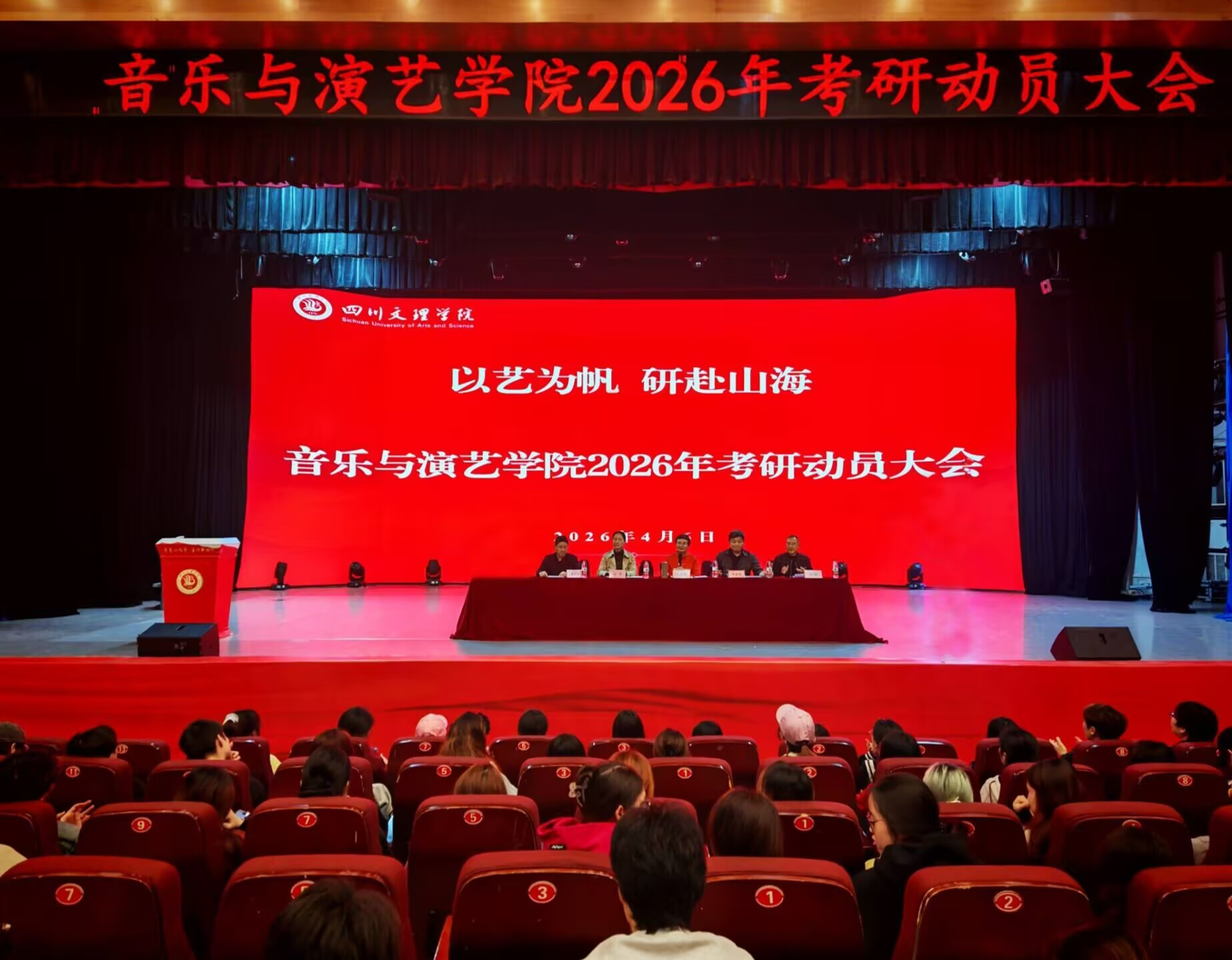 4月6日晚7点,音乐与演艺学院“以艺为帆 研赴山海”2026年考研动员会在音乐厅顺利召开。院长何凤先、党委副书记冯蜜、副院长冉明、副院长潘广宇和组织员吴辉兵出席,特邀到中华传统文化学院党政办主任唐莉,我院专业教师代表和辅导员、2022级考研上岸优秀学生及大二、大三全体学生参会,共同明晰研途方向、点燃备考热情,会议由学院党委书记阮碧辉主持。